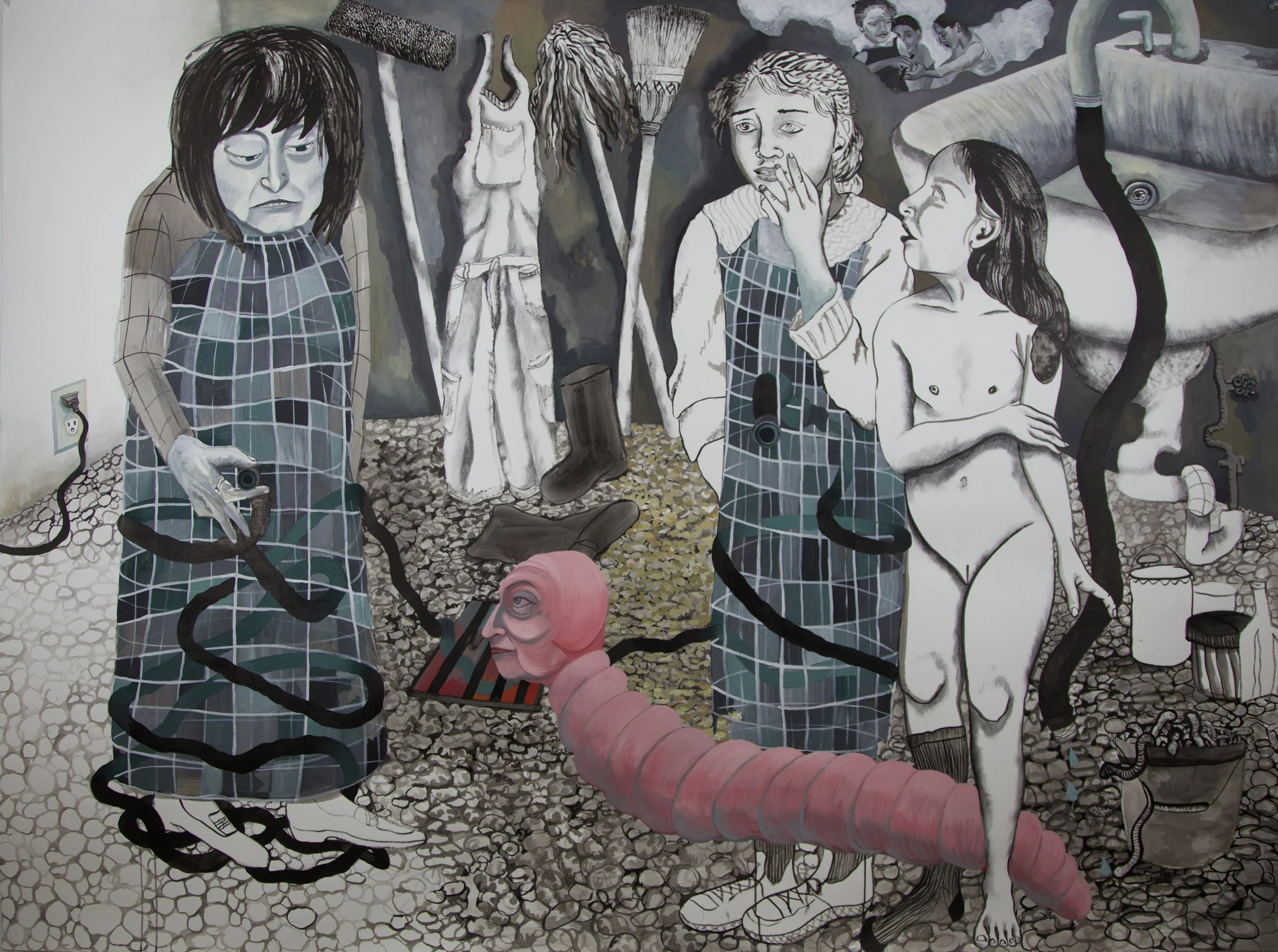 Drawings and performances investigating hierarchies of age and gender, human agency, and the submission and resistance to internal and external forms of control between Mrs. G, her young students and The Big and Little Worms